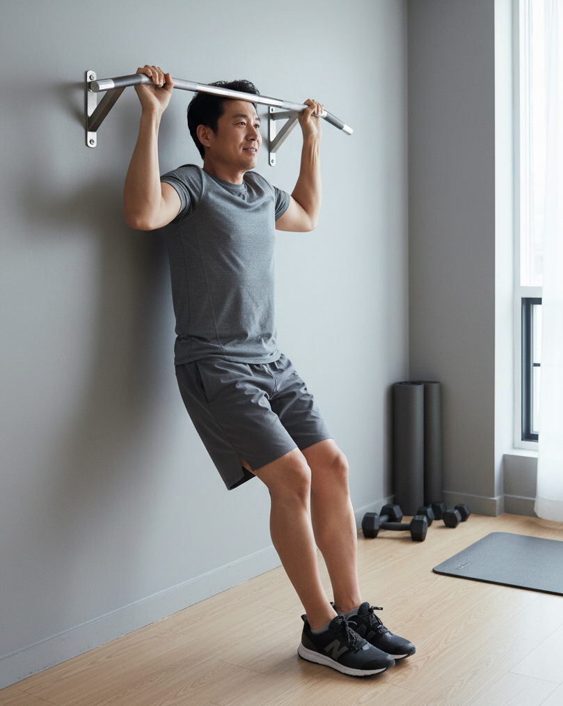 2단계: 벽을 이용한 보조 매달림 : 철봉이 높거나 두려운 경우 벽에 등을 붙인 상태에서 팔을 위로 들어 올려 매달리는 ‘의자 보조 데드행’을 실시합니다. 이때 발끝이 바닥에 닿게 하여 체중의 60~70%만 걸리게 하는 것이 안전합니다.