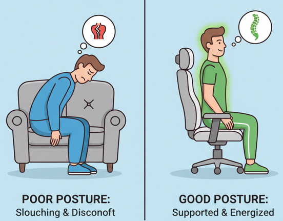 허리에 영향을 주는 또 다른 중요한 생활습관은 앉는 자세입니다. 현대인들은 하루 대부분의 시간을 앉아서 보내는데, 어떤 가구에 앉느냐에 따라 허리에 가해지는 부담이 달라집니다. 쇼파는 편안함을 주지만, 대개 등이 뒤로 젖혀지면서 허리가 자연스럽게 구부러지는 자세를 유도합니다. 이런 자세는 척추가 C자 형태로 변형되며, 허리디스크 환자의 경우 디스크 압력이 증가해 통증이 심해질 수 있습니다. 특히 다리를 꼬고 앉거나 옆으로 비스듬히 기대는 자세는 척추 균형을 무너뜨려 장기적으로 허리뿐만 아니라 골반까지 틀어지게 만듭니다.