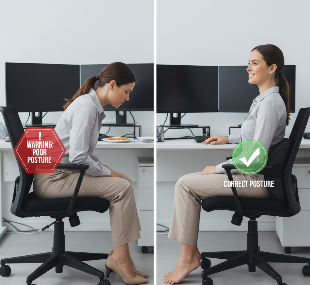 장시간 앉을 수밖에 없는 직장인의 경우 다음과 같은 관리가 필수적입니다. 1. 의자 높이 조절: 무릎이 엉덩이보다 약간 낮게 유지되도록 조절합니다. 2. 허리 지지 쿠션 사용: 요추 전만을 유지하여 디스크 압박을 최소화합니다. 3. 30분마다 일어나기: 2~3분이라도 허리를 펴고 몸을 스트레칭합니다. 4. 업무 중 틈새운동: 목 돌리기, 어깨 돌리기, 무릎 들어 올리기 등을 습관화합니다.
