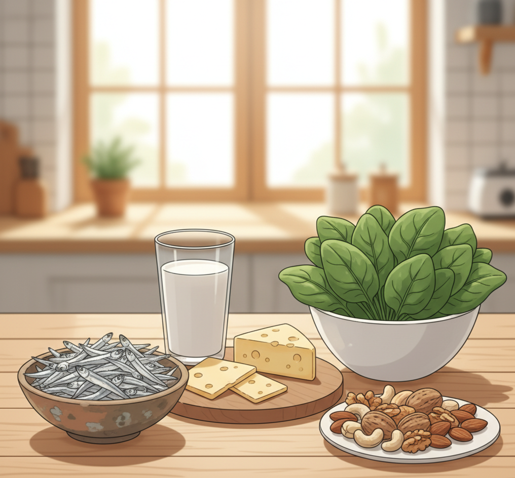 칼슘은 우유, 치즈, 요구르트 같은 유제품뿐 아니라 멸치, 뱅어포, 연어, 두부, 브로콜리 등에서도 얻을 수 있습니다. 또한 지나친 나트륨 섭취는 칼슘 배출을 촉진하므로, 짠 음식을 줄이고 신선한 식재료 위주의 식단을 유지하는 것이 허리 건강에 유리합니다.